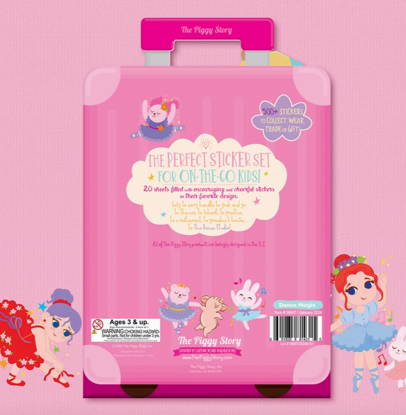 The Perfect Sticker Set for On-the-Go Kids! Each Pack includes 20 Sheets of "Happy Sticker Fun!" 500+ stickers to collect, wear, trade or gift. • 20 sheets of high-quality, colorful dance-themed stickers • 500+ stickers included • Set comes in adorable “Suitcase” folder to take stickers on-the-go • Handle to take anywhere • Stickers feature adorable illustrations and encouraging words to inspire little ones 20 sheets filled with encouraging and cheerful stickers in adorable ballerina designs. Makes a wonderful gift, stocking stuffer, Easter Basket filler, party favor or back-to-school treat! Easy to carry handle to grab and go... to the car, to school, to practice, to a restaurant, to grandma's house...to the DANCE STUDIO!