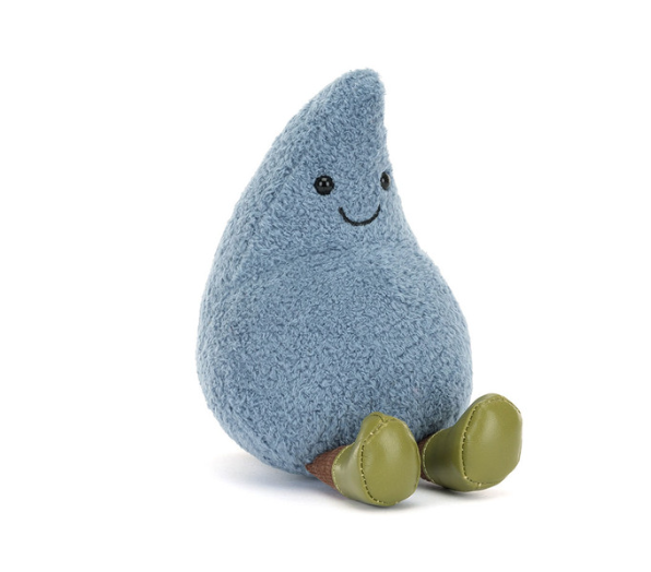Amuseables Happy Raindrop is a drop of pure joy. Formed of textured blue fur, this smiling raindrop has fine cord cocoa legs, and is sporting a pair of olive green rain boots. The perfect companion for splashing around on a rainy day!
