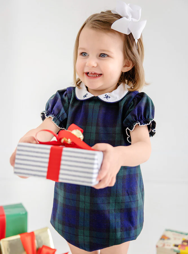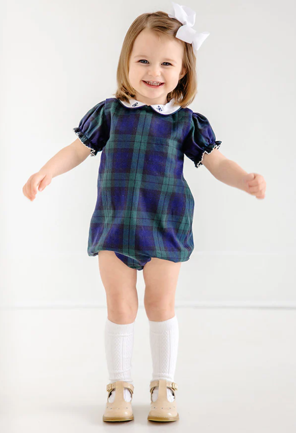 From the bow detailing on the collar, to the ruffle sleeve, our Bedford Bubble is sure to melt your heart. Featuring Berwick Black Watch with Worth Avenue White & Nantucket Navy Bows, this little bubble is sure to be darling on your little lady!