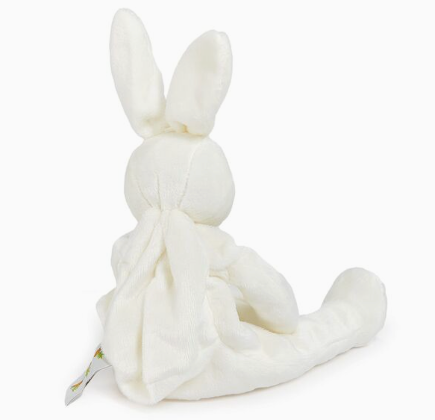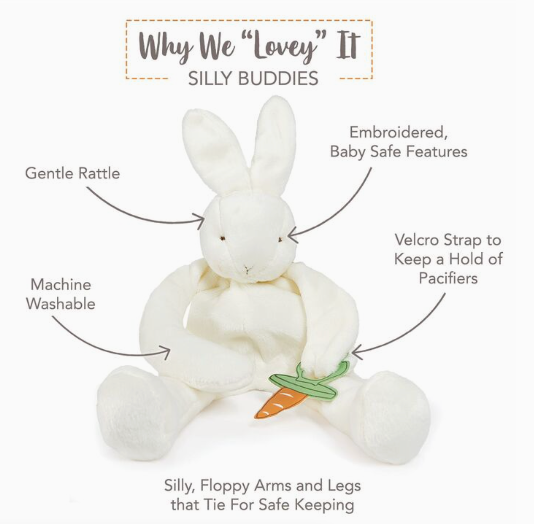 Size: 10" Safe for all ages Embroidered Details Lovey and Pacifier in one Gentle rattle 100% polyester Easy care; machine wash and dry low heat Bun Bun Bunny Silly Buddy animal pacifier holder is the perfect gift for your wee one with multiple ways to soothe. A classic gender-neutral white bunny favorite. Super-soft and floppy, super silly, and oh so useful, this take-a-long pal will tie onto baby's stroller, crib, or car seat. Soft white velour with pacifier holder hand loop and fun rattling head, this is sure to be a favorite security item of baby and Mom and Dad alike! Signature three carrot tag for little one's fingers, super-soft fabrics, and embroidered details.