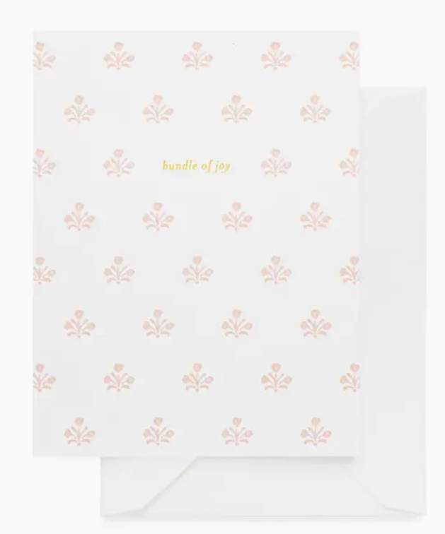 4.25 x 5.5 inches * Folded Card * Foil Printed * Crisp White Paper * Gold Foil * Pink Floral Pattern * Crisp White Envelope Send a thoughtful message with one of our letterpress printed baby greeting cards. A blank interior lets you add your own personal touch. Hand printed in Los Angeles.