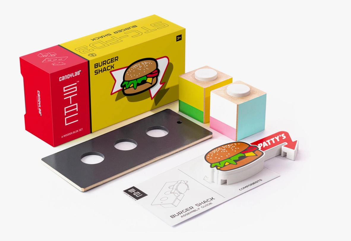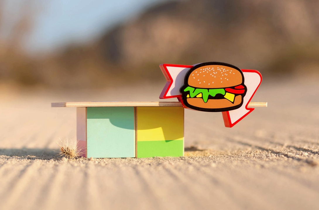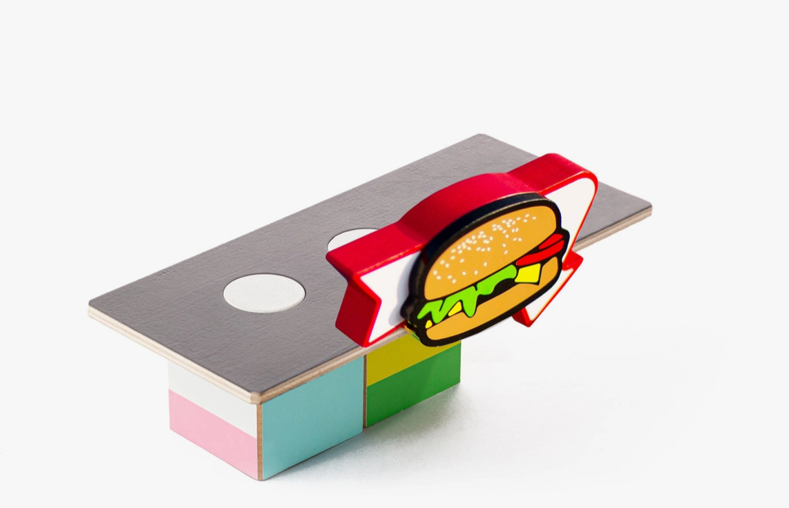 Warning, franchise in the making! After a resounding success in the food truck hustle, Patty's is now adding a proper brick-and-mortar location. Big chains out there, just watch out! Our newest STAC sets are modular building blocks that are ready for play - you can combine signs, roofs, and multiple blocks with a clever all-wooden system. Playful carchitecture play at its best. Pairs perfectly with its matching Food Van, sold separately. Materials & Info: Solid Beech Wood, water-based paint, and clear urethane coat. . Safety tested according to US CPSIA and European, Australian, and New Zealand regulations. Not for children under 3 years of age. Dimensions: 8.5" L x 3.5" W x 4.5" H (22cm L x 9cm W x 10.5cm H)