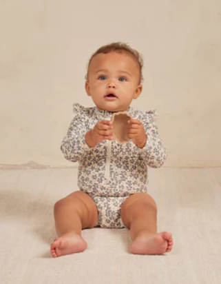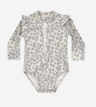 This one-piece rashguard swimsuit will have your little one protected from the sun in style. Featuring a zipper front closure, ruffle details at the leg openings and snaps at the bottom for easy changing.All Quincy Mae swimwear is UPF 50+ so you can stay protected from the sun in style.Featuring our 'poppy' all over pattern on ivory.Care: Machine wash cold. Hang dry.