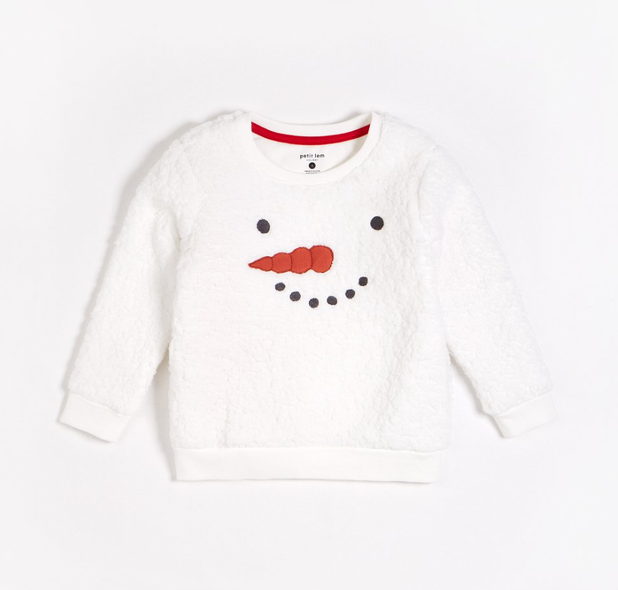 Take dress up to a new level by camouflaging in the snow with this snowman sweatshirt. The super fleecy top is finished with a coal smile and carrot nose. The rounded neckline makes the sweatshirt easy to pull on and off if they get too hot while running around in the snow. Pair with pants from the Christmas loungewear collection for a super snuggly day with family.