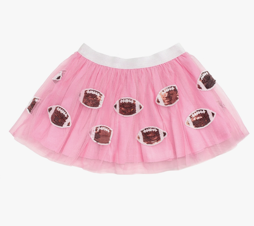 The football tutu is a fun skirt and dress up tutu for celebrating game day! Features: Pink tulle and pink cotton lining Brown and white sequin footballs White glitter elastic waistband Care: hand wash and line dry The Sweet Wink difference: Super soft tulle that doesn’t scratch or itch Cotton lining provides extra coverage and comfort “shed-free” embellishments ensure glitter does not sprinkle around the house