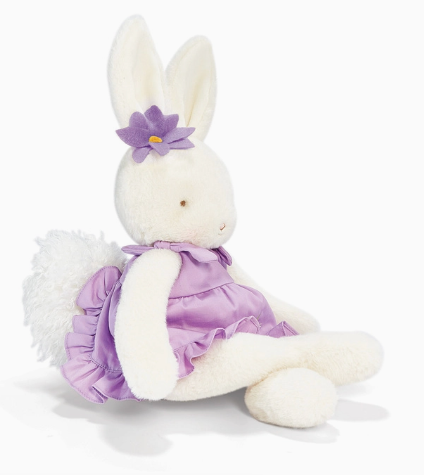 15” tall Embroidered features Safe for all ages 100% polyester surface wash/spot clean Garden Bloom, a delightful bunny straight out of a blossoming garden! Garden Bloom stuffed animal wears a sweet purple dress adorned with delicate embroidery, and a cheerful yellow flower tucked in her ear, adding a charming touch to her ensemble. With soft cream-colored fur, embroidered face, and cute rosy cheeks, Garden Bloom’s presence is both endearing and heartwarming. Her dangly legs and oversized tail add a playful twist to her appearance, making her an ideal companion for imaginative adventures and cuddly moments.