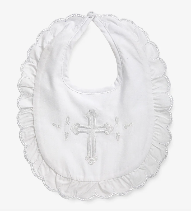 Give an Elegant Baby Girl's Christening Bib as a gift at your next baby shower or christening! This classic christening bib features a beautiful embroidered cross and eyelet ruffle!