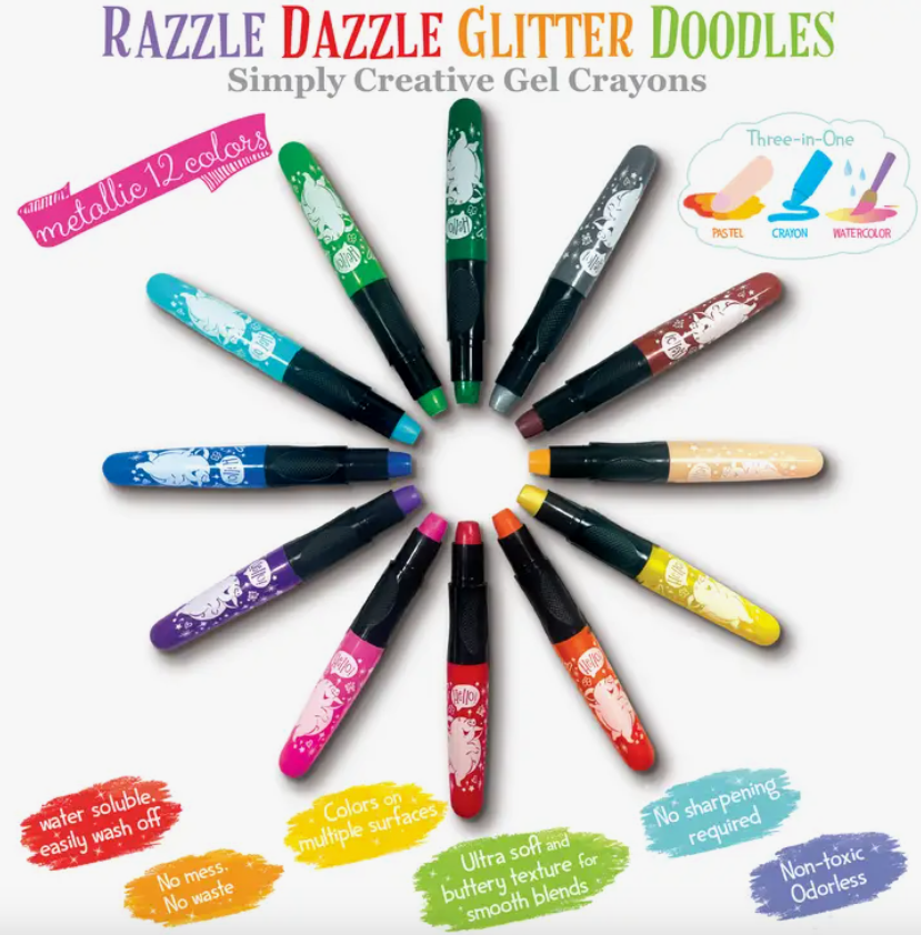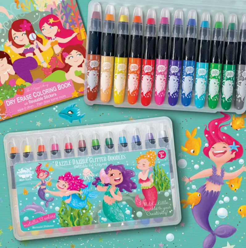 Little creators can add sparkle to their creativity with 12 metallic gel crayons in the Mermaid Shimmer Design! Made for small hands and big imaginations, these versatile glitter gel crayons will inspire crayon, pastel, and watercolor creations! Color with the ultra-soft crayons, smudge to create a pastel effect or use a wet brush to have a watercolor effect! Crayons are non-toxic, odorless and washable! Pair with The Piggy Story's Dry Erase Coloring Books and Color on Black, Color on White Totes! Not intended for children under the age of 3.