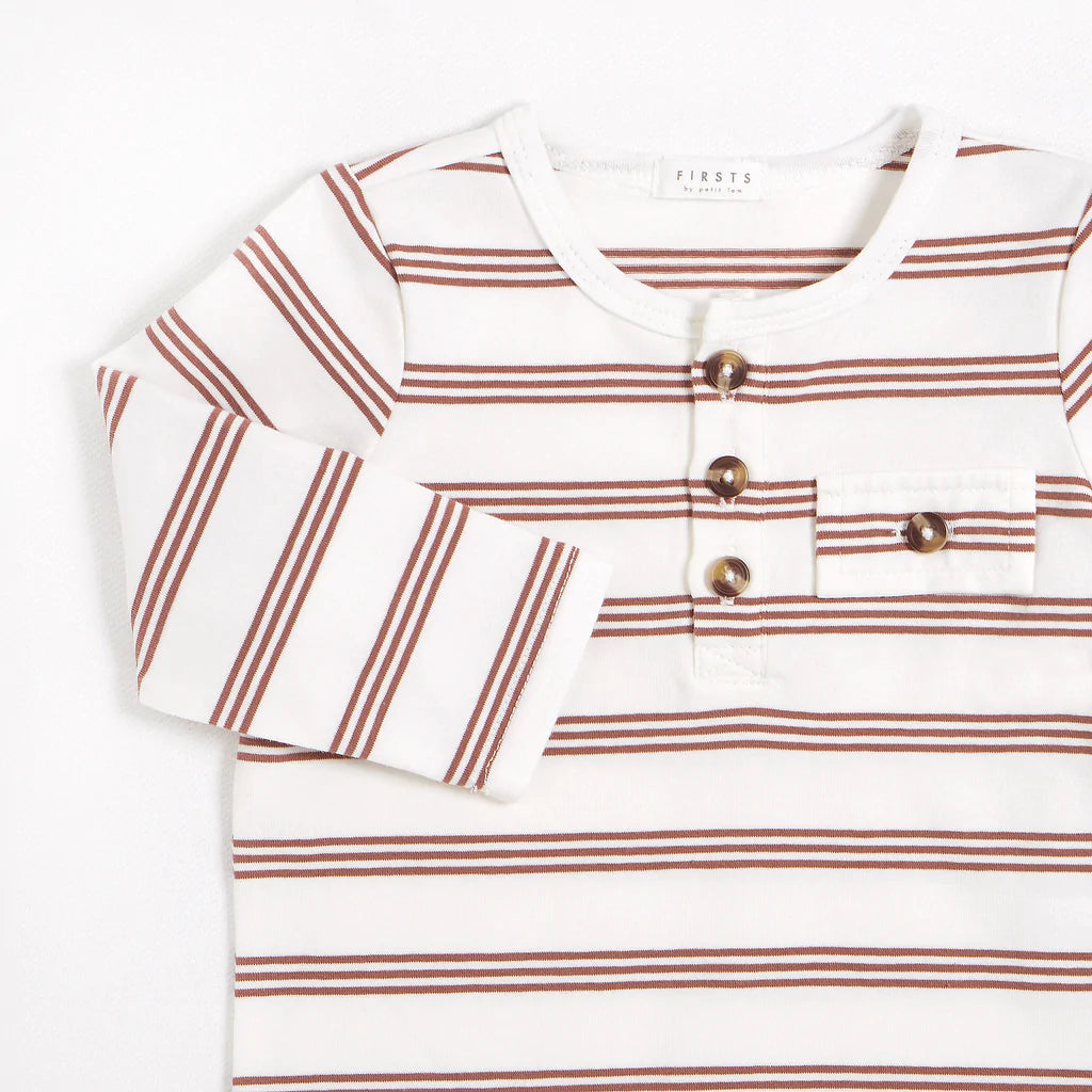 This sweet 2-piece set features a long-sleeved top with matching joggers. The red striped top has a series of buttons down the front to make over the head changing that little bit easier. The joggers have turned up ankles for a cool and casual style and an elasticated waistband for extra comfort. Made from organically grown cotton and a little elastane for stretch, the set is extra cozy and perfect for all day wear.