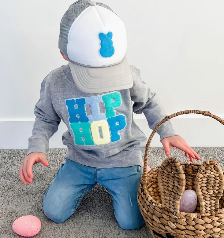 The Hip Hop Patch Sweatshirt is a fun and festive sweatshirt for celebrating Easter! Features: * Crewneck Color: Gray * Patch Color: Multicolor chenille with gold glitter outline * Material: 60% Cotton / 40% Polyester Fleece * Features: Tagless inside neck label for an itch-free wear; cozy fleece lining * Fit: Toddler Unisex; True to Size * Care: Machine washable, tumble dry low Each sweatshirt is hand pressed with love in our hometown warehouse.