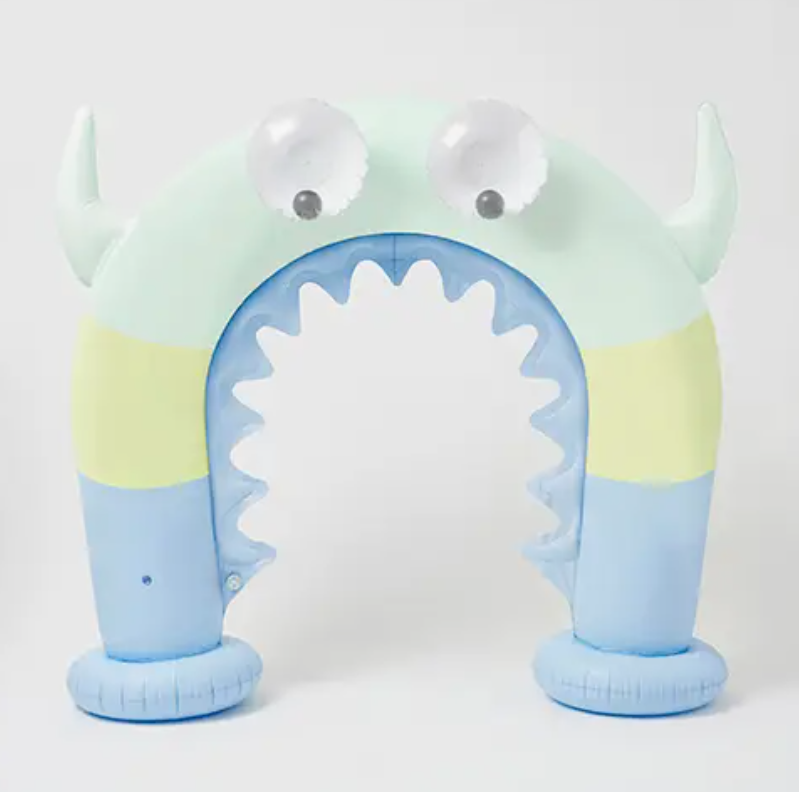 Comes with hose adaptor, which fits onto most garden hoses. Features 3D googly eyes with gradient ombre print. Run through the mouth of the monster where the water sprays out from the teeth. Includes repair patch in case of punctures. Made from durable, non-toxic Phthalate free PVC. Our floats and inflatables carry important safety labels that may not be shown in all photography.