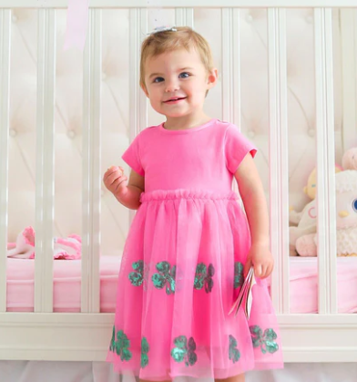 Color: Pink cotton bodice with a pink tulle skirt overlay with green sequin shamrocks