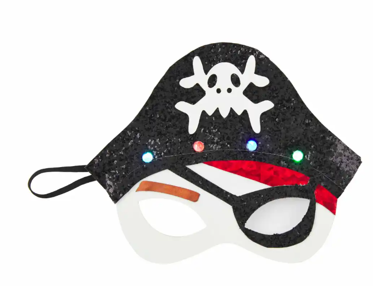 Stock your costume closet with our Kid's Pirate Mask. The mask features fun glitter felt fabric. The mask also features LED light-up. The mask works with included batteries. Add this mask to your head with the elastic strap. This mask is intended for children ages three and older.