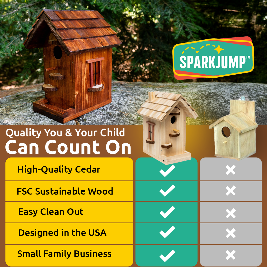Each kit includes 7 pre-cut cedar wood pieces, cedar shingles, 2 decorative windows, 6 wood slices, nails, silicone wood glue, 2 eye hooks, perch, sandpaper pieces, and easy-to-follow instructions. (Hammer not included.)