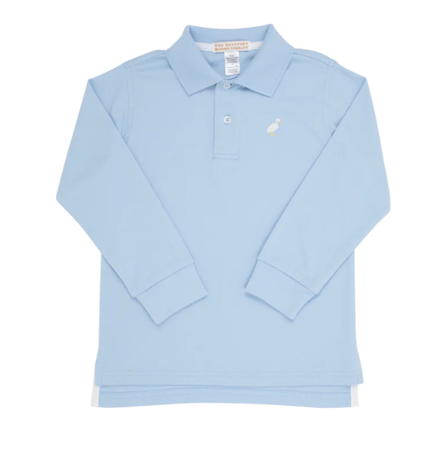Our Long Sleeve Prim & Proper Polo in Beale Street Blue with Multicolor Stork is perfect for your dapper little gent. You'll be reaching for this one all season long. Regardless of the occasion, your little man will look as sharp as can be when he's wearing this polo.