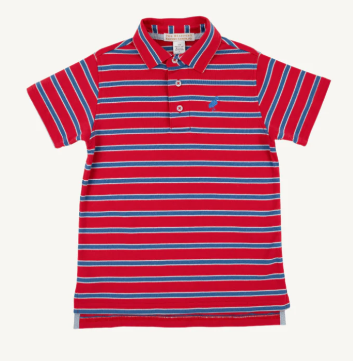Our Prim & Proper Polo in Richmond Red, Wood Boat Blue, & Buckhead Blue Stripe with Wood Boat Blue Stork will have him looking perfectly preppy for any occasion! Your little gent will love wearing this sweet polo all season long.