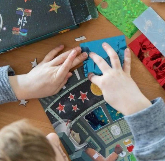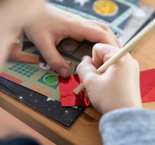 Space suits, rocket ships, planets and stars are all waiting to be brought alive with a sparkling rub of holographic foil! Simply select a colour illustrated space card and use the enclosed wooden lifter to peel white sections off the picture, revealing adhesive sections. Grab a shimmering foil sheet, rub the foil onto the sticky area and voila! A beautiful shiny artwork.