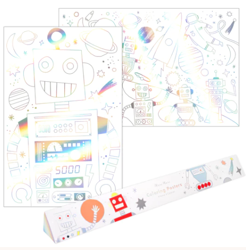 Little astronauts will love these shiny space coloring posters. Featuring silver foil holographic illustrations of robots and a space scene, they'll look amazing as a bedroom decoration. A fabulous gift for a rainy day fun activity.
