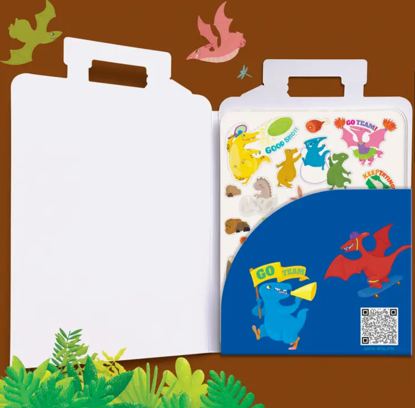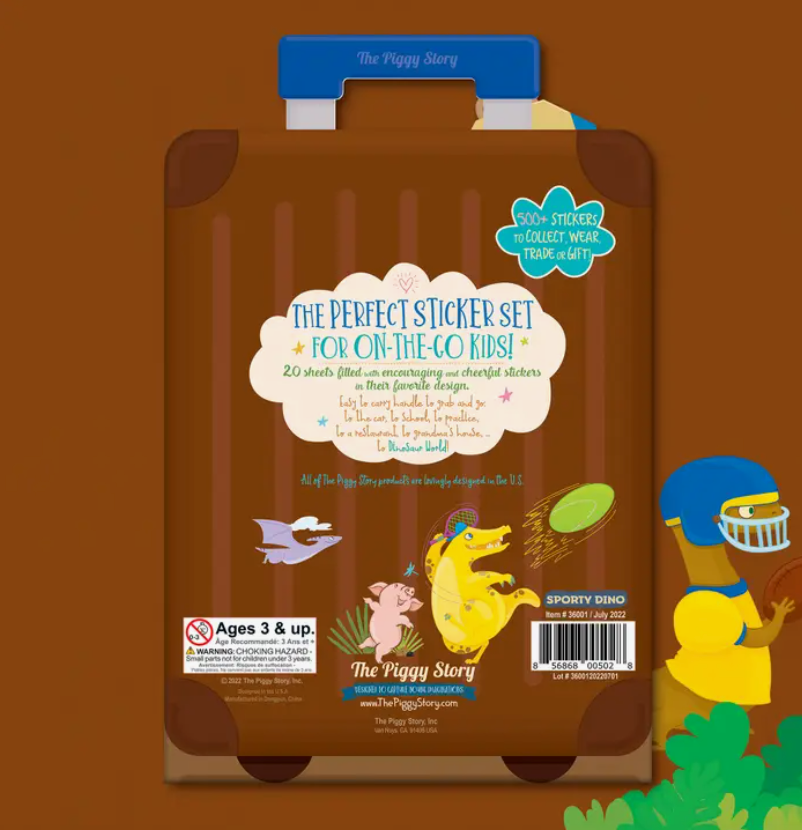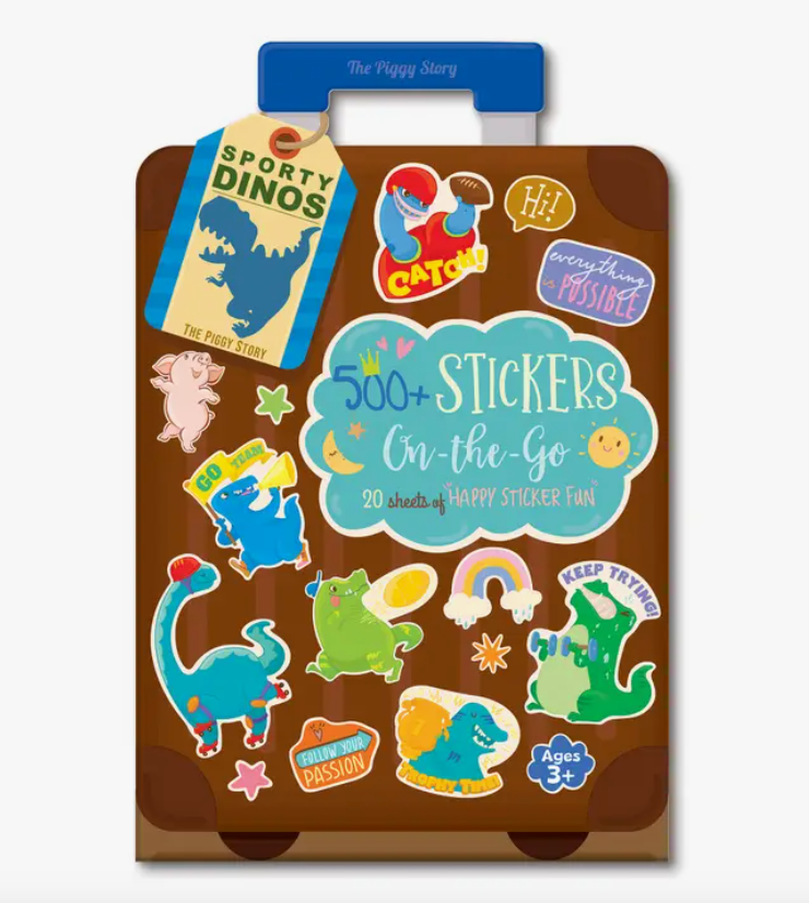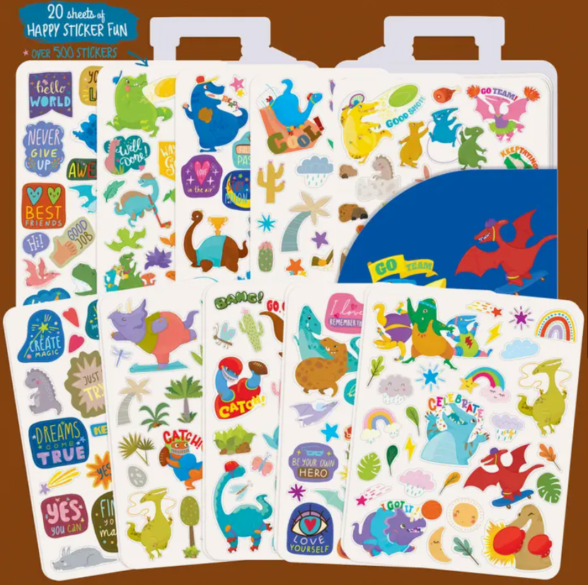 The Perfect Sticker Set for On-the-Go Kids! Includes: 20 Sheets of "Happy Sticker Fun!" 500+ stickers to collect, wear, trade or gift 20 sheets filled with encouraging and cheerful stickers in their favorite design. Easy to carry handle to grab and go... to the car, to school, to practice, to a restaurant, to grandma's house...to DINOSAUR WORLD!