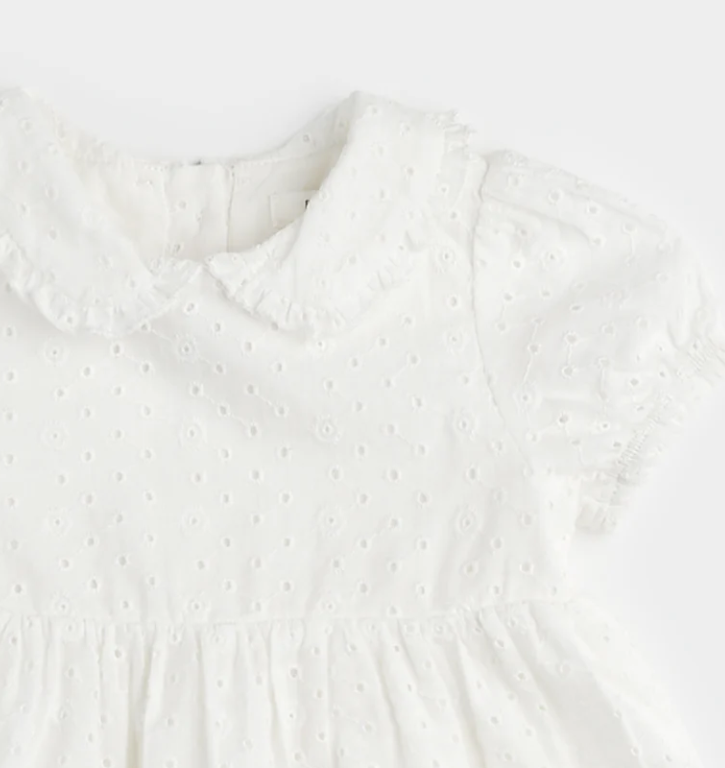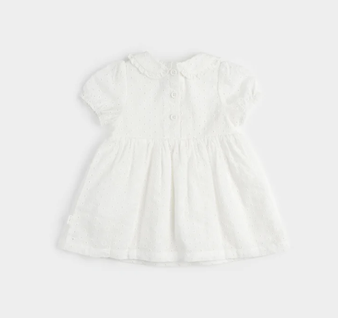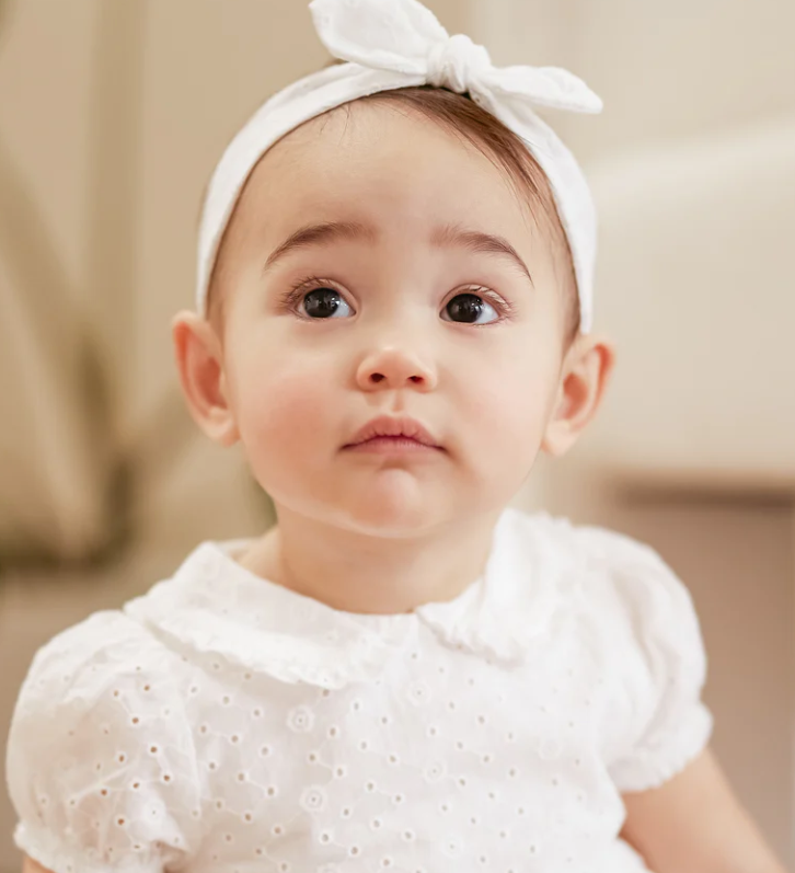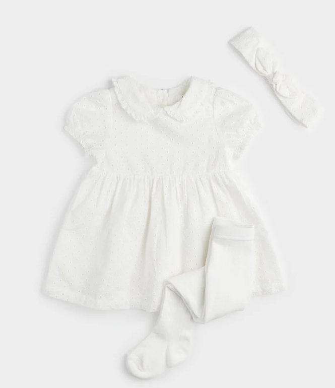 This adorable 3-piece dress set is a dreamy outfit choice for family photos, weddings and passing down through the generations. Featuring a sweet peter-pan collared dress, tights and a matching headband, it has everything they need to feel and look their best. The dress is made from a light and breathable organic cotton eyelet and finished with a little collar and frilly trim. It fastens at the back and will be their new favorite thing to wear – even on an ordinary day! The headband has a sweet bow at the front and is gently elasticated for a comfortable fit.