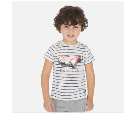 Short sleeved T-shirt for boy. Round neckline. Made from 100% cotton fabric. Decorative elements: design on the front. Striped pattern.