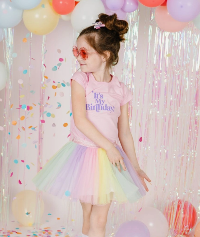 Calling all birthday girls! The it's my birthday short sleeve shirt is the perfect tee for celebrating the birthday girl! This tee features a fun purple and aqua graphic, on a pink shirt. Printed on our super soft cotton tees. Shirt color: pink Graphic color: purple Material: 5oz 100% combed ringspun cotton Features: topstitch ribbed collar, side seam construction Care: machine washable, tumble dry low Pair with a Sweet Wink tutu and birthday hair accessory for the ultimate birthday outfit! Each tee shirt is made by hand and packaged carefully in the sweet wink warehouse.