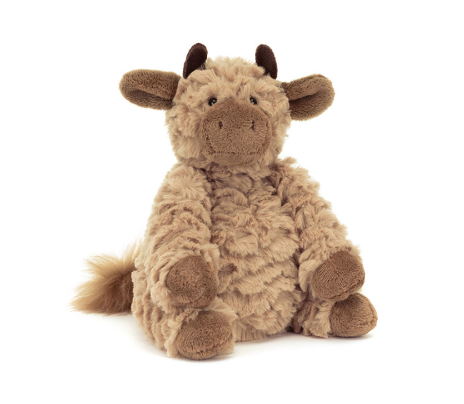 Fuddles Calf is the sweetest new arrival to the meadow. In textured tan fur, this fluffy baby bovine has a long tail with fluffy tip, and dark brown baby horns. With brown hooves and tulip ears, Fuddles Calf has a matching snout with stitched nostrils and big smile. The perfect gift for any farmyard fan.