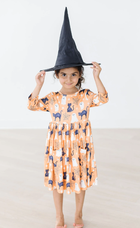The perfect dress for Halloween, school, and everyday play! Designed by a mom and a dad. Mom wanted something twirly, comfortable and easy to wash. Dad wanted something easy to get on his chubby, big headed toddler. Designed with a scoop back for quick on and off, and higher neckline for modesty.