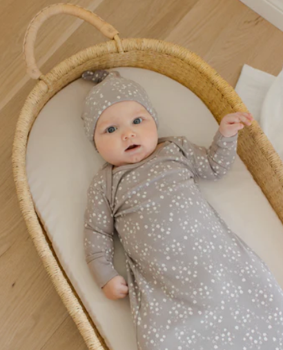 Baby gown with elastic bottom opening and fold over hand-mitts in our signature soft and stretchy bamboo fabric. Includes a coordinating knotted hat.