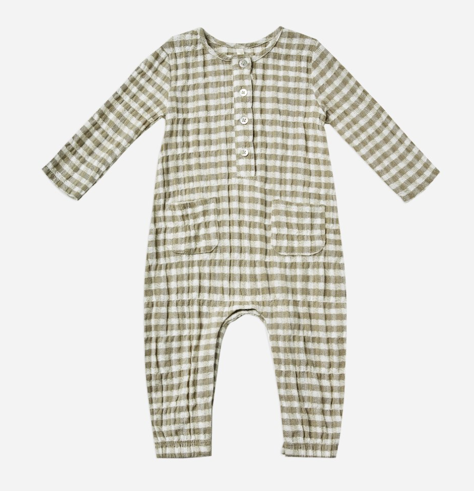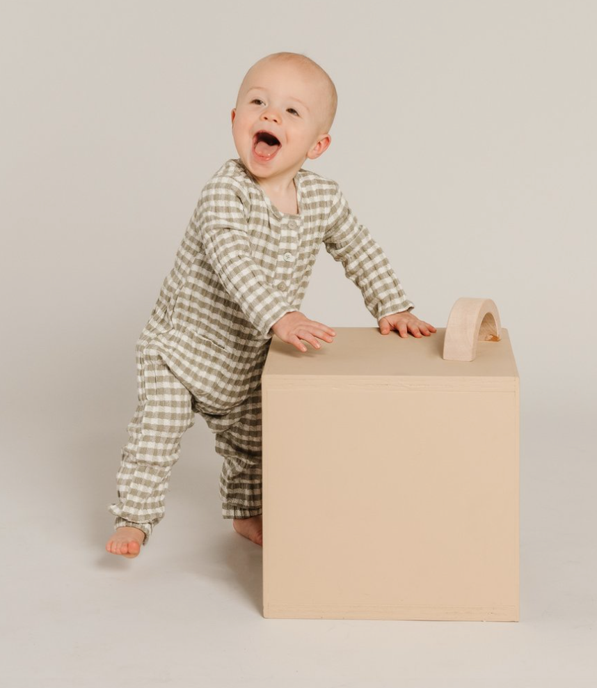 Longsleeve jumpsuit with wood buttons down the chest, and hidden snaps along the inseam for easy changing. Elastic at leg openings for the perfect fit.