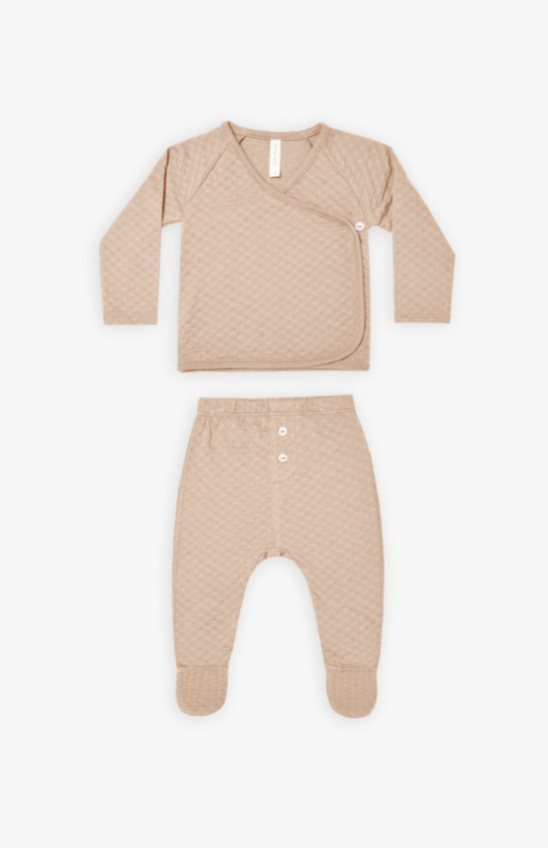 A set with our longsleeve wrap top made out of our organic cotton pointelle with button on the side and matching footed pants.