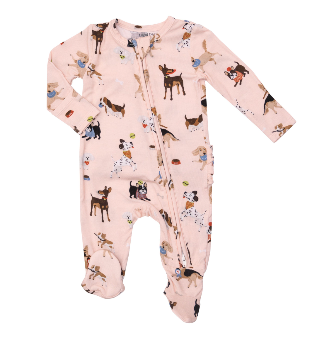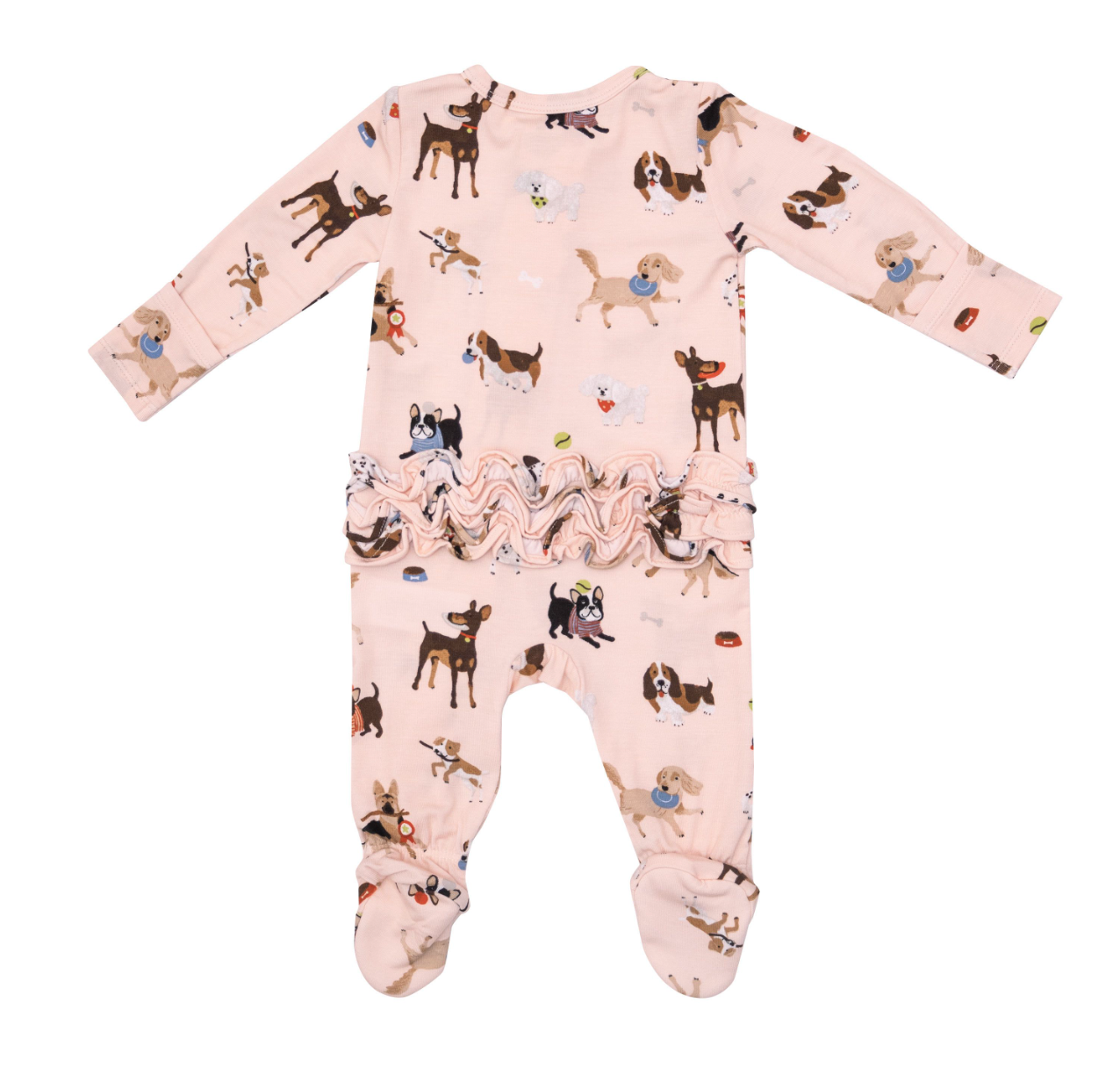 Two Way Ruffle Back Zipper Footie | Doggy Daycare (Pink) – Babycakes Children's Boutique