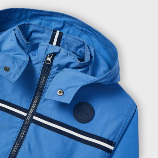 Long sleeved Windbreaker jacket for boy 2 to 7 years old. Hooded collar. Detachable hood. Front, central zip fastening. Made using lightweight, breathable fabric which is comfortable to wear. Functional front pockets.