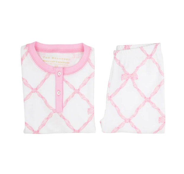 The softest and sweetest pajamas in the whole wide world, our Sara Jane's Sweet Dream Set in Belle Meade Bow with Palm Beach Pink is what sweet dreams are made of!