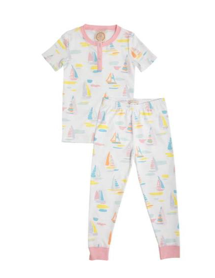 Our Sandyport Sailboats print has us dreaming of sailing the ocean blue! Your little lady is sure to get the best sleep in our Sara Jane's Short Sleeve Set featuring our Sandpearl Pink. These night nights are perfect for family trips to the beach house or staycations at home!