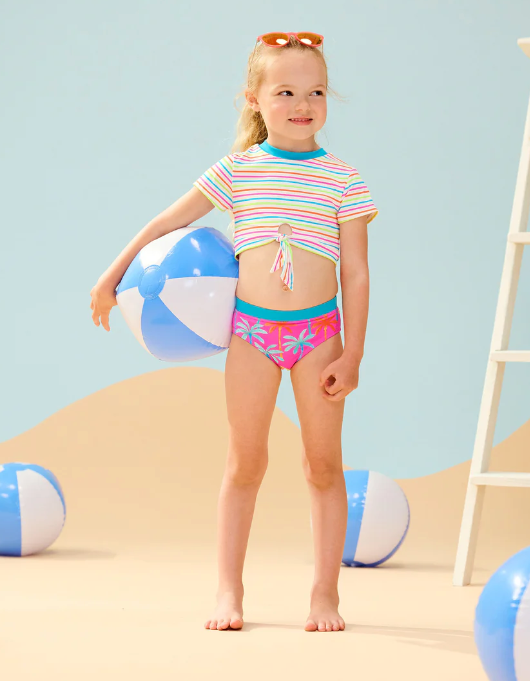 Help your little one paint a picture of paradise with our girls printed palms short sleeve tankini set! This set features fuchsia purple bottoms with a turquoise waistband and a multicolor palm tree pattern, while the top boasts multicolor stripes, a turquoise crewneck, and a tie front detail. The perfect look for their next trip down south!
