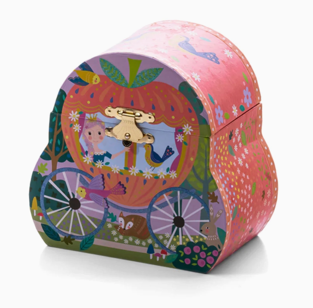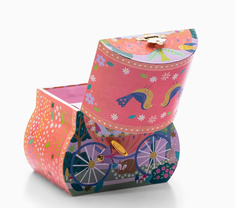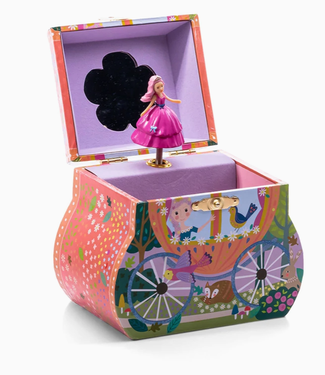Shaped as a beautiful carriage this Fairy Tale musical jewellery box is adorable. Featuring a princess in her carriage with glitter detail, open the lid to reveal a princess figuerine which swirls around to the tune of 'teddy bears picnic'. With a lovely lilac flocked finish inside and a flower shaped mirror. This comes beautifully gift boxed in a full colour box to make it extra special. Turn the winder and open the lid to hear the music play. Glitter detail on the jewellery box. Swirling figuerine. Perfect for storing little trinkets. Includes our new colurful gift boxes.