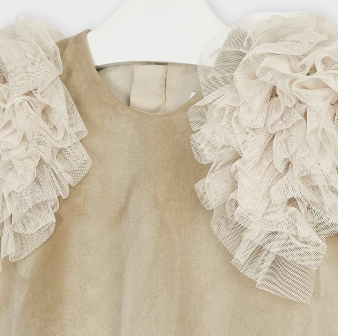 Short sleeved Dress with contrasting fabrics for girl aged 2 to 6 years. Round neckline. Opening on the back with an invisible zip. Made using elegant and classic velvet fabric.
